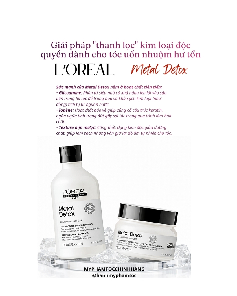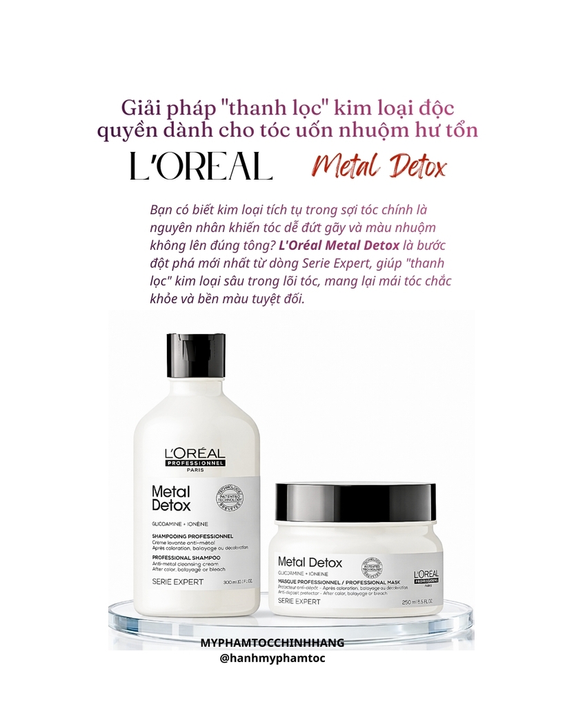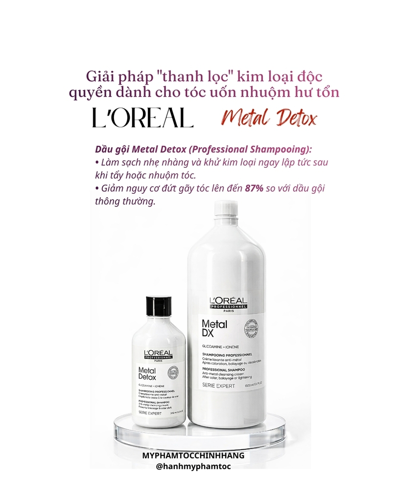 Dầu gội và dầu hấp L'Oréal Metal DX là bộ sản phẩm chuyên biệt dành cho tóc nhuộm hoặc tóc đã qua xử lý hóa chất, giúp thải độc kim loại tích tụ trong sợi tóc, bảo vệ màu nhuộm và giảm gãy rụng.