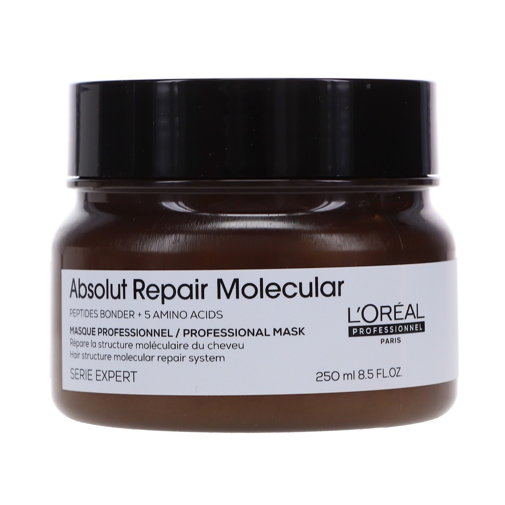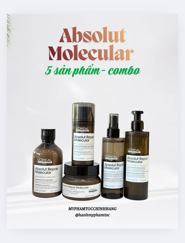 bộ sản phẩm phục hồi chuyên sâu L'Oréal Professionnel Absolut Repair Molecular gồm: dầu gội, dầu xả (serum xả), mặt nạ khô (leave-in), dưỡng chất nền, kem hấp.