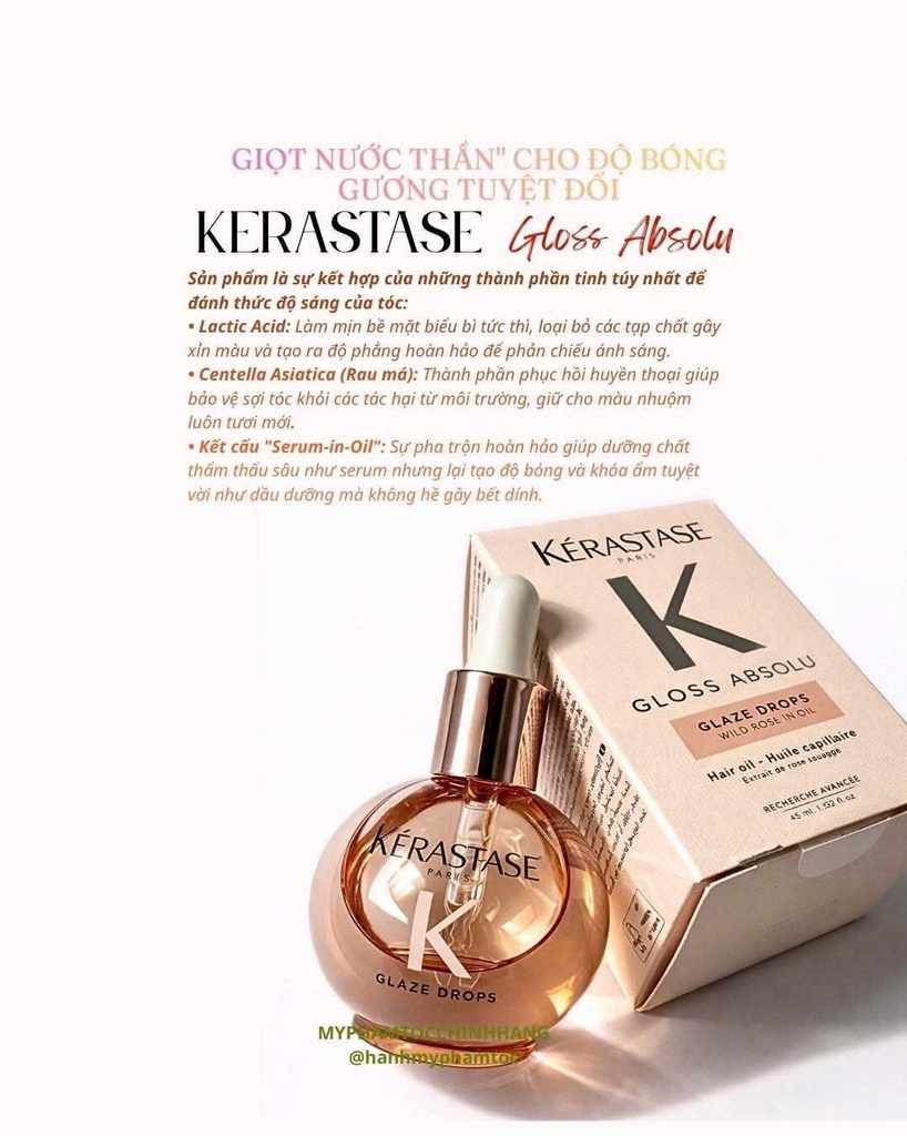 Tinh chất bóng gương Kérastase Gloss Absolu Glaze Drops ứng dụng cấu trúc serum-in-oil giúp dưỡng chất thẩm thấu sâu nhưng vẫn tạo lớp màng phản chiếu ánh sáng trên bề mặt tóc. Thành phần nổi bật gồm Lactic Acid giúp làm mịn lớp biểu bì và Centella Asiatica hỗ trợ bảo vệ sợi tóc khỏi tác động môi trường, giữ màu nhuộm tươi lâu.