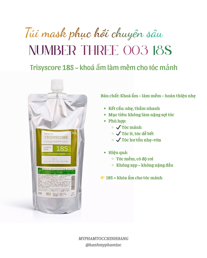 003 Trisyscore CEC là một trong ba dòng kem hấp phục hồi tóc chuyên sâu thuộc bộ sản phẩm Trisyscore của thương hiệu Number Three (No3) đến từ Nhật Bản. Sản phẩm được thiết kế đặc biệt để phục hồi và nuôi dưỡng tóc hư tổn, giúp tóc trở nên mềm mại, bóng mượt và khỏe mạnh hơn.